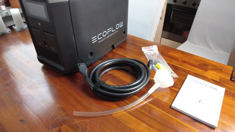 Außer der Bedienungsanleitung liegen dem Gerät noch ein 5 Meter langes Verbindungskabel zur Delta Pro bzw. Max und ein kleines Werkzeugset bei sowie ein Trichter mit Schlauch, um Öl einzufüllen.